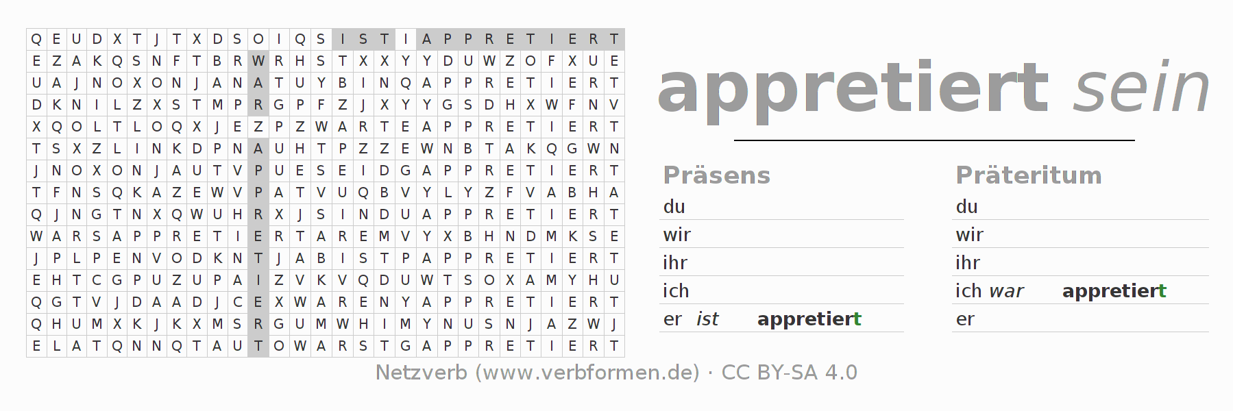 Mit diesen Wortsuchrätseln kann man auf herausfordernde Art und Weise die Konjugation des deutschen Verbs appretieren erlernen.