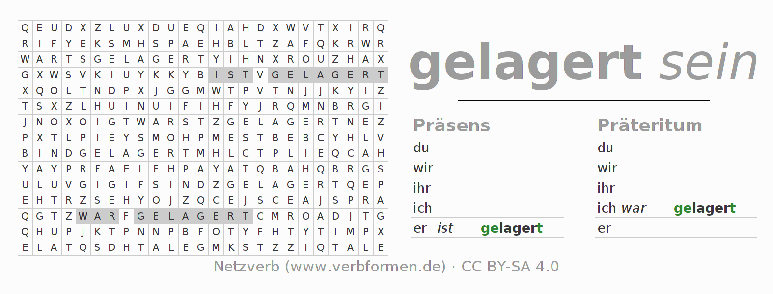 Mit diesen Wortsuchrätseln kann man auf herausfordernde Art und Weise die Konjugation des deutschen Verbs lagern erlernen.