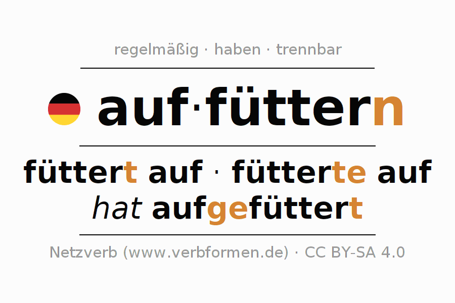 - Präsens: fütt(e)r(e) (du) auf, füttern wir auf, füttert (ihr) auf, füttern Sie auf