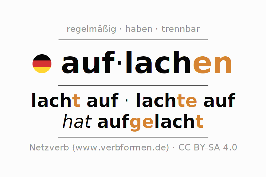 - Präsens: lach(e) (du) auf, lachen wir auf, lacht (ihr) auf, lachen Sie auf