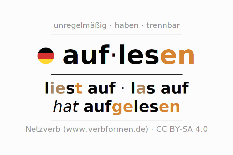 - Futur I: ich werde auflesen, du wirst auflesen, er wird auflesen, wir werden auflesen, ihr werdet auflesen, sie werden auflesen