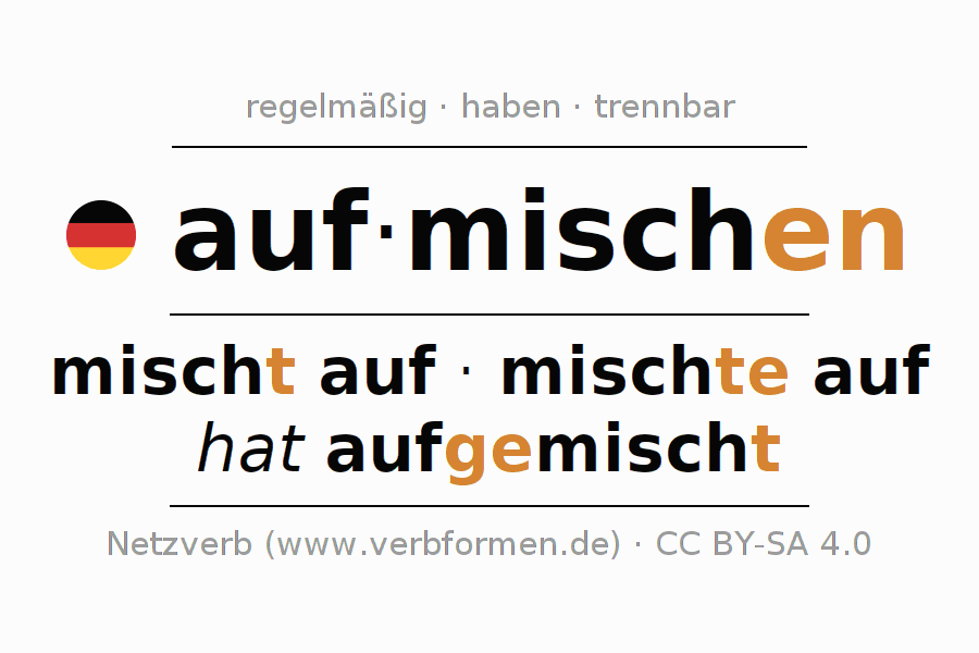 - Präsens: misch(e) (du) auf, mischen wir auf, mischt (ihr) auf, mischen Sie auf