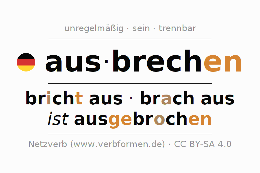 Die aus·brechen Konjugation online als Verbtabelle mit allen Verbformen in Singular (Einzahl) und Plural (Mehrzahl) in allen Personen (1. Person, 2.Person, 3. Person) übersichtlich dargestellt. Die Beugung bzw. Flexion des Verbs aus·brechen ist somit eine Hilfestellung für Hausaufgaben, Prüfungen, Klausuren, für den Deutschuntericht der Schule, zum Deutsch Lernen, für das Studium, Deutsch als Fremdsprache (DaZ), Deutsch als Zweitsprache (DaZ) und für die Erwachsenenbildung. Gerade auch für Deutschlernende ist die korrekte Konjugation des Verbs bzw. die korrekt flektierten Formen (bricht aus - brach aus - ist ausgebrochen) entscheidend. Weitere Informationen finden sich unter Wiktionary ausbrechen und unter ausbrechen im Duden.