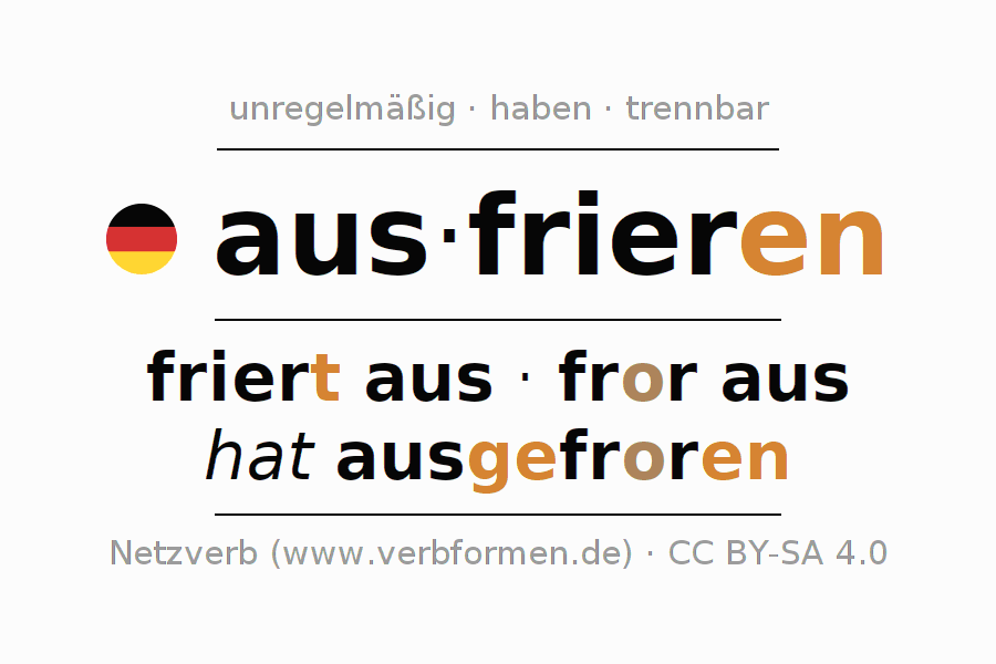 Das Konjugieren des Verbs ausfrieren erfolgt unregelmäßig. Die Stammformen sind friert aus, fror aus und hat ausgefroren. Der Ablaut erfolgt mit den Stammvokalen ie - o - o. Als Hilfsverb von ausfrieren wird "haben" verwendet. Es gibt jedoch auch Zeitformen mit dem Hilfsverb "sein". Die Vorsilbe aus- von ausfrieren ist trennbar. Die Beugung erfolgt im Aktiv und die Darstellung als Hauptsatz. Zum besseren Verständnis stehen unzählige Beispiele für das Verb ausfrieren zur Verfügung. Zum Üben und Festigen gibt es außerdem kostenlose Arbeitsblätter für ausfrieren. Man kann nicht nur ausfrieren konjugieren, sondern alle deutschen Verben. Das Verb gehört zum Wortschatz des Zertifikats Deutsch bzw. zur Stufe C2. Kommentare ☆