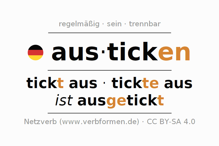 - Präsens: tick(e) (du) aus, ticken wir aus, tickt (ihr) aus, ticken Sie aus