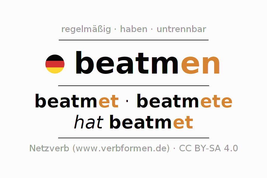 - Präsens: beatme (du), beatmen wir, beatmet (ihr), beatmen Sie