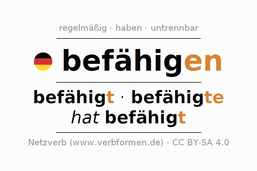 - Perfekt: ich habe befähigt, du habest befähigt, er habe befähigt, wir haben befähigt, ihr habet befähigt, sie haben befähigt