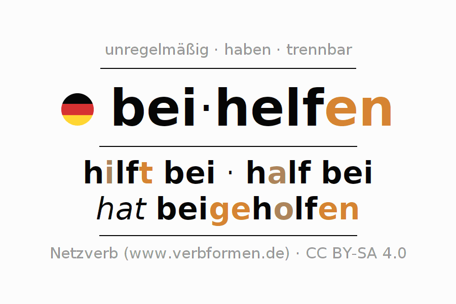 - Präsens: hilf (du) bei, helfen wir bei, helft (ihr) bei, helfen Sie bei