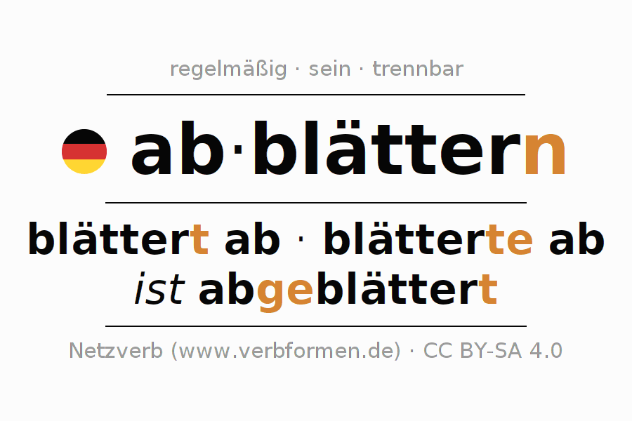 Beispiele für die Verwendung der Konjugation des Verbs abblättern. Dabei handelt es sich um reale Sätze und um Sätze aus dem Projekt Tatoeba. Für jede konjugierte Form wird ein solcher Beispielsatz angezeigt. Die Verbform wird dabei hervorgehoben. Sind mehrere Sätze vorhanden, wird zufällig ein Beispiel mit dem deutschen Verb abblättern (ist) ausgewählt. Um die Konjugation nicht nur an den Beispielen nachzuvollziehen, sondern auch zu trainieren, stehen Arbeitsblätter für das Verb abblättern zur Verfügung.