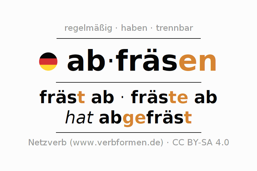 Beispiele für die Verwendung der Konjugation des Verbs abfräsen. Dabei handelt es sich um reale Sätze und um Sätze aus dem Projekt Tatoeba. Für jede konjugierte Form wird ein solcher Beispielsatz angezeigt. Die Verbform wird dabei hervorgehoben. Sind mehrere Sätze vorhanden, wird zufällig ein Beispiel mit dem deutschen Verb abfräsen ausgewählt. Um die Konjugation nicht nur an den Beispielen nachzuvollziehen, sondern auch zu trainieren, stehen Arbeitsblätter für das Verb abfräsen zur Verfügung.