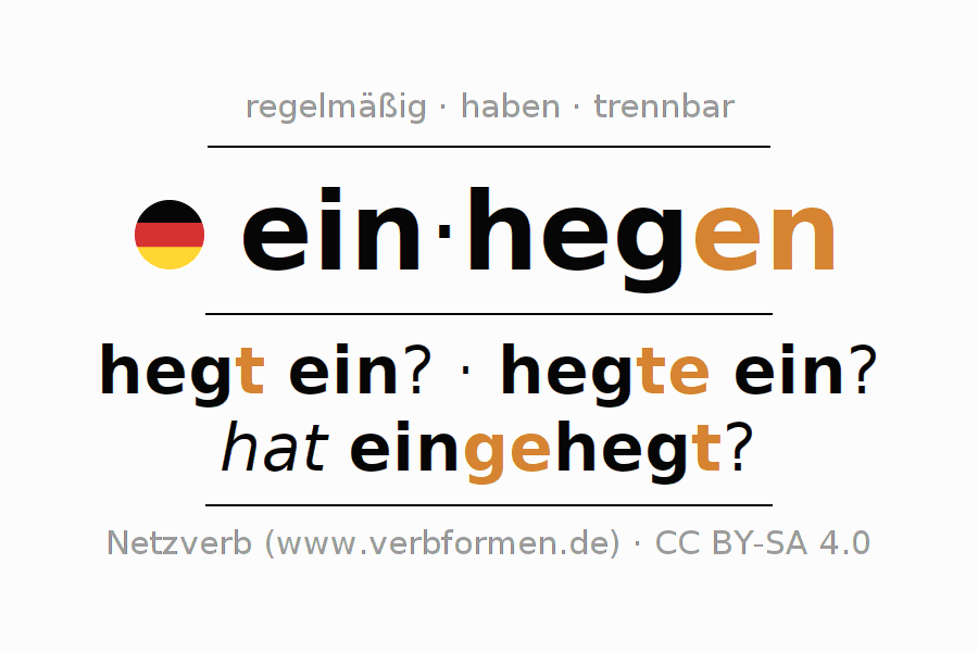 Beispiele für die Verwendung der Konjugation des Verbs einhegen. Dabei handelt es sich um reale Sätze und um Sätze aus dem Projekt Tatoeba. Für jede konjugierte Form wird ein solcher Beispielsatz angezeigt. Die Verbform wird dabei hervorgehoben. Sind mehrere Sätze vorhanden, wird zufällig ein Beispiel mit dem deutschen Verb einhegen ausgewählt. Um die Konjugation nicht nur an den Beispielen nachzuvollziehen, sondern auch zu trainieren, stehen Arbeitsblätter für das Verb einhegen zur Verfügung.