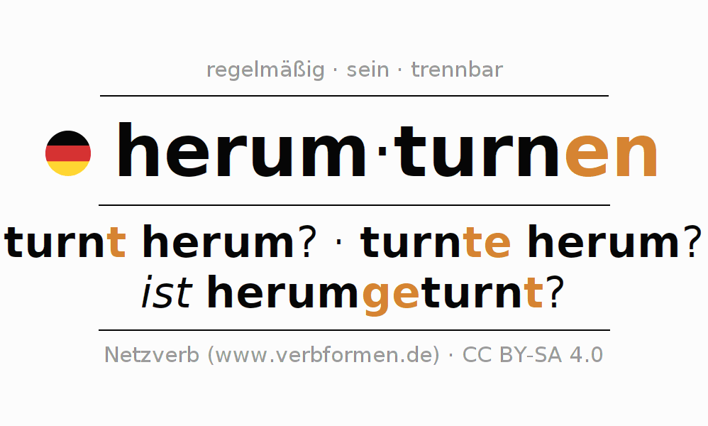 Beispiele für die Verwendung der Konjugation des Verbs herumturnen. Dabei handelt es sich um reale Sätze und um Sätze aus dem Projekt Tatoeba. Für jede konjugierte Form wird ein solcher Beispielsatz angezeigt. Die Verbform wird dabei hervorgehoben. Sind mehrere Sätze vorhanden, wird zufällig ein Beispiel mit dem deutschen Verb herumturnen (ist) ausgewählt. Um die Konjugation nicht nur an den Beispielen nachzuvollziehen, sondern auch zu trainieren, stehen Arbeitsblätter für das Verb herumturnen zur Verfügung.