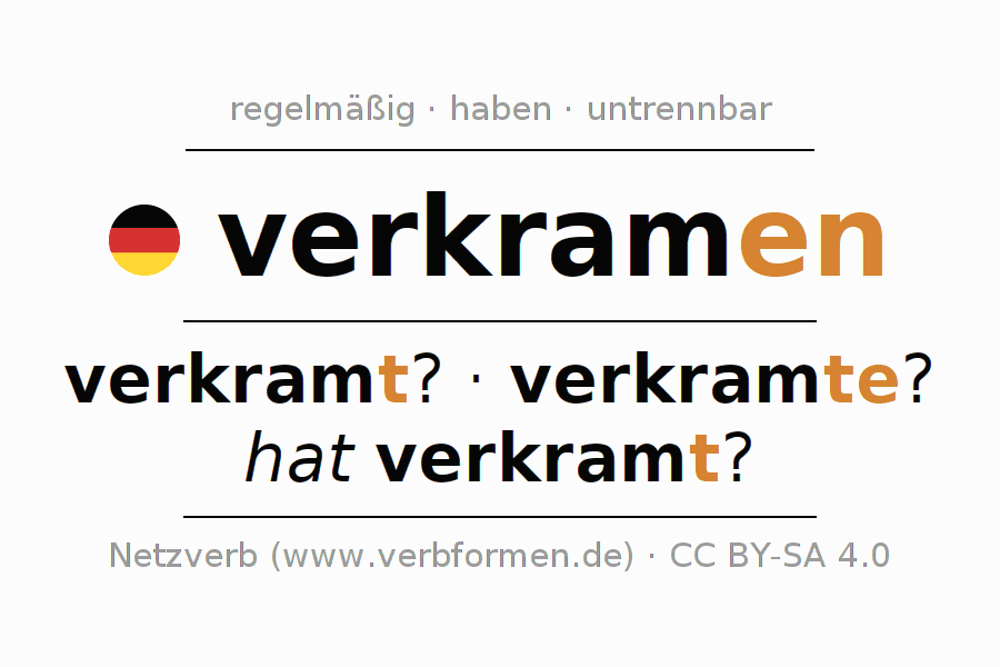 Beispiele für die Verwendung der Konjugation des Verbs verkramen. Dabei handelt es sich um reale Sätze und um Sätze aus dem Projekt Tatoeba. Für jede konjugierte Form wird ein solcher Beispielsatz angezeigt. Die Verbform wird dabei hervorgehoben. Sind mehrere Sätze vorhanden, wird zufällig ein Beispiel mit dem deutschen Verb verkramen ausgewählt. Um die Konjugation nicht nur an den Beispielen nachzuvollziehen, sondern auch zu trainieren, stehen Arbeitsblätter für das Verb verkramen zur Verfügung.