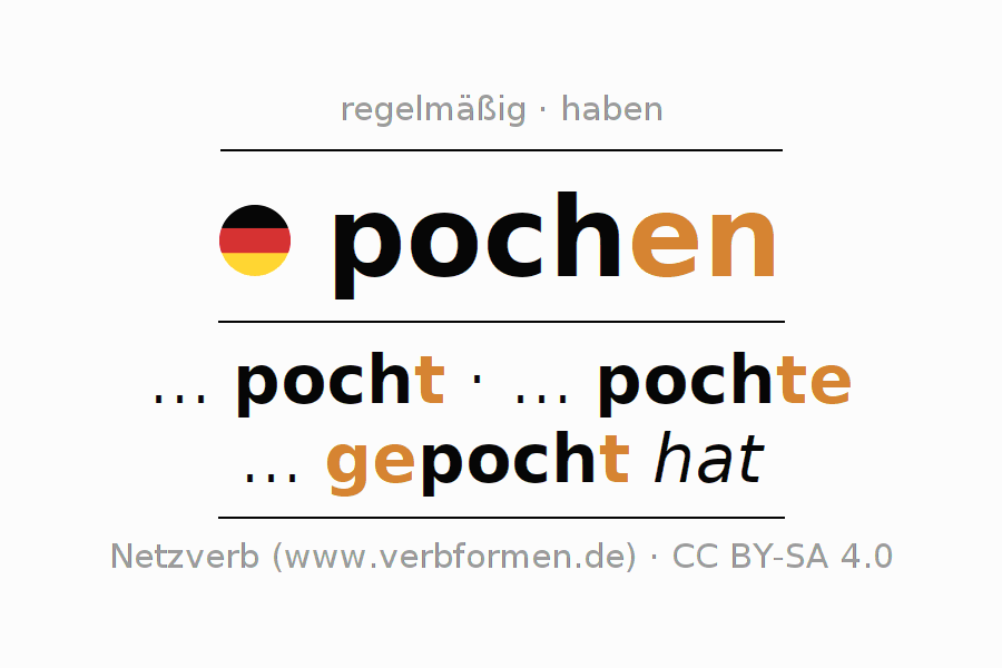 Beispiele für die Verwendung der Konjugation des Verbs pochen. Dabei handelt es sich um reale Sätze und um Sätze aus dem Projekt Tatoeba. Für jede konjugierte Form wird ein solcher Beispielsatz angezeigt. Die Verbform wird dabei hervorgehoben. Sind mehrere Sätze vorhanden, wird zufällig ein Beispiel mit dem deutschen Verb pochen ausgewählt. Um die Konjugation nicht nur an den Beispielen nachzuvollziehen, sondern auch zu trainieren, stehen Arbeitsblätter für das Verb pochen zur Verfügung.