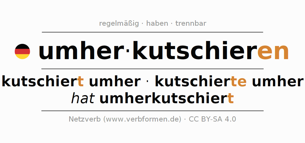 Beispiele für die Verwendung der Konjugation des Verbs umherkutschieren. Dabei handelt es sich um reale Sätze und um Sätze aus dem Projekt Tatoeba. Für jede konjugierte Form wird ein solcher Beispielsatz angezeigt. Die Verbform wird dabei hervorgehoben. Sind mehrere Sätze vorhanden, wird zufällig ein Beispiel mit dem deutschen Verb umherkutschieren ausgewählt. Um die Konjugation nicht nur an den Beispielen nachzuvollziehen, sondern auch zu trainieren, stehen Arbeitsblätter für das Verb umherkutschieren zur Verfügung.