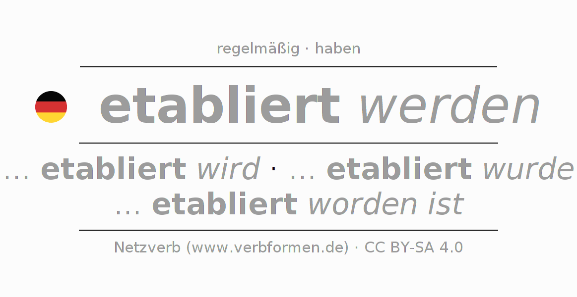 Beispiele für die Verwendung der Konjugation des Verbs etablieren. Dabei handelt es sich um reale Sätze und um Sätze aus dem Projekt Tatoeba. Für jede konjugierte Form wird ein solcher Beispielsatz angezeigt. Die Verbform wird dabei hervorgehoben. Sind mehrere Sätze vorhanden, wird zufällig ein Beispiel mit dem deutschen Verb etablieren ausgewählt. Um die Konjugation nicht nur an den Beispielen nachzuvollziehen, sondern auch zu trainieren, stehen Arbeitsblätter für das Verb etablieren zur Verfügung.