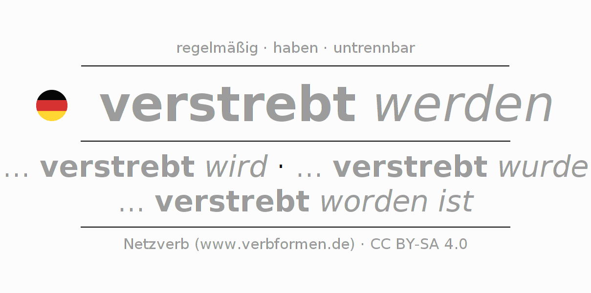 Beispiele für die Verwendung der Konjugation des Verbs verstreben. Dabei handelt es sich um reale Sätze und um Sätze aus dem Projekt Tatoeba. Für jede konjugierte Form wird ein solcher Beispielsatz angezeigt. Die Verbform wird dabei hervorgehoben. Sind mehrere Sätze vorhanden, wird zufällig ein Beispiel mit dem deutschen Verb verstreben ausgewählt. Um die Konjugation nicht nur an den Beispielen nachzuvollziehen, sondern auch zu trainieren, stehen Arbeitsblätter für das Verb verstreben zur Verfügung.