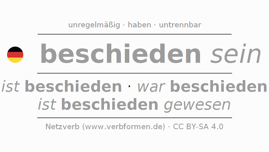 Beispiele für die Verwendung der Konjugation des Verbs bescheiden. Dabei handelt es sich um reale Sätze und um Sätze aus dem Projekt Tatoeba. Für jede konjugierte Form wird ein solcher Beispielsatz angezeigt. Die Verbform wird dabei hervorgehoben. Sind mehrere Sätze vorhanden, wird zufällig ein Beispiel mit dem deutschen Verb bescheiden ausgewählt. Um die Konjugation nicht nur an den Beispielen nachzuvollziehen, sondern auch zu trainieren, stehen Arbeitsblätter für das Verb bescheiden zur Verfügung.