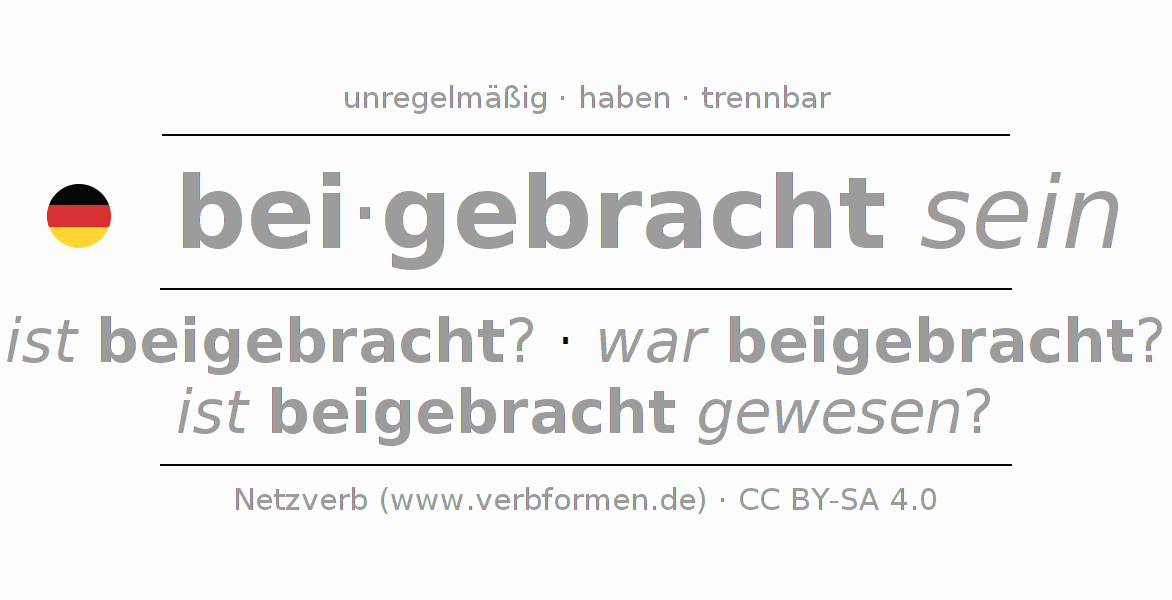 Beispiele für die Verwendung der Konjugation des Verbs beibringen. Dabei handelt es sich um reale Sätze und um Sätze aus dem Projekt Tatoeba. Für jede konjugierte Form wird ein solcher Beispielsatz angezeigt. Die Verbform wird dabei hervorgehoben. Sind mehrere Sätze vorhanden, wird zufällig ein Beispiel mit dem deutschen Verb beibringen ausgewählt. Um die Konjugation nicht nur an den Beispielen nachzuvollziehen, sondern auch zu trainieren, stehen Arbeitsblätter für das Verb beibringen zur Verfügung.