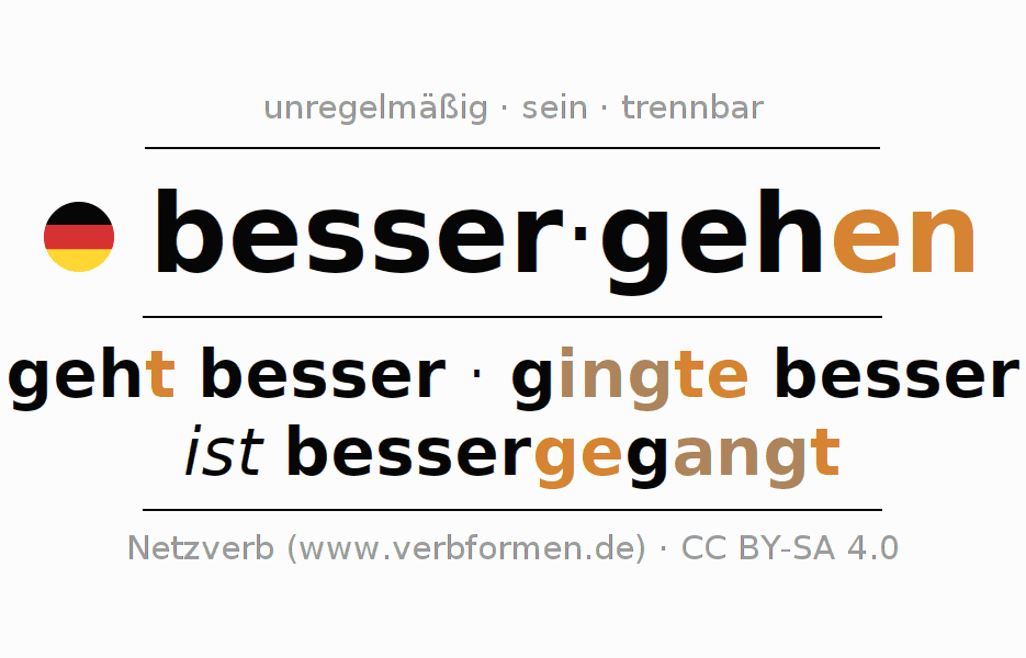 Die besser·gehen Konjugation online als Verbtabelle mit allen Verbformen in Singular (Einzahl) und Plural (Mehrzahl) in allen Personen (1. Person, 2.Person, 3. Person) übersichtlich dargestellt. Die Beugung bzw. Flexion des Verbs besser·gehen ist somit eine Hilfestellung für Hausaufgaben, Prüfungen, Klausuren, für den Deutschuntericht der Schule, zum Deutsch Lernen, für das Studium, Deutsch als Fremdsprache (DaZ), Deutsch als Zweitsprache (DaZ) und für die Erwachsenenbildung. Gerade auch für Deutschlernende ist die korrekte Konjugation des Verbs bzw. die korrekt flektierten Formen (geht besser - gingte besser - ist bessergegangt) entscheidend. Weitere Informationen finden sich unter Wiktionary bessergehen und unter bessergehen im Duden.