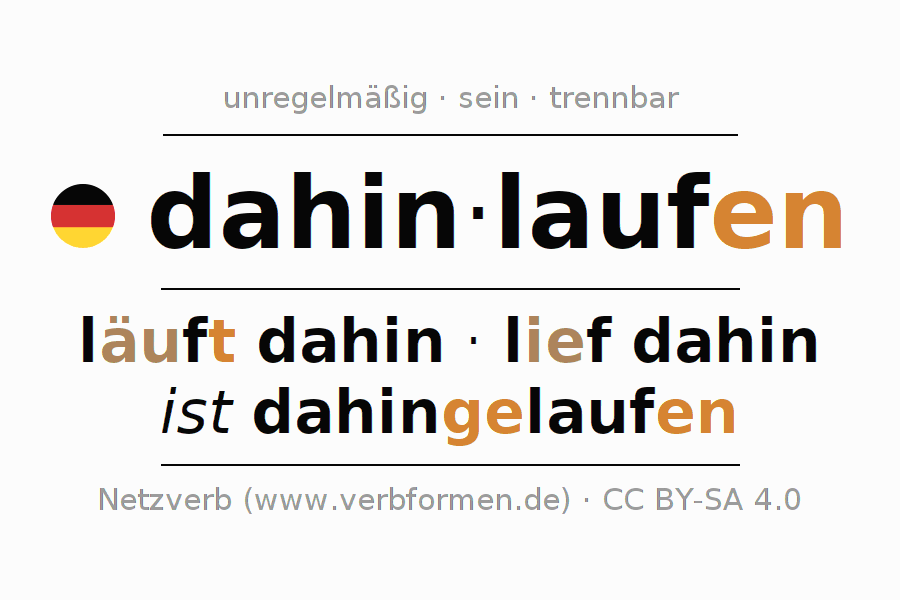 Das Verb dahinlaufen konjugiert im Indikativ Aktiv in den Zeitformen Gegenwart, Vergangenheit und Zukunft