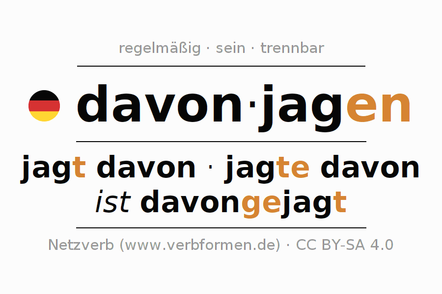 - Präsens: jag(e) (du) davon, jagen wir davon, jagt (ihr) davon, jagen Sie davon