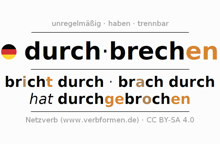 Das Verb durch-brechen (hat) konjugiert im Indikativ Aktiv in den Zeitformen Gegenwart, Vergangenheit und Zukunft