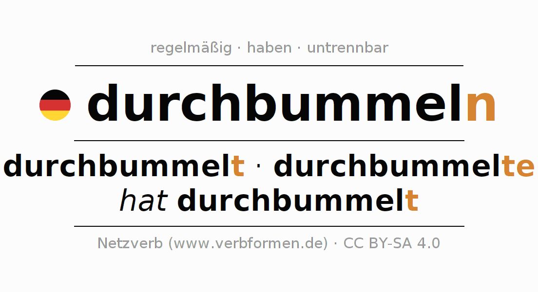 Die durchbummeln Konjugation online als Verbtabelle mit allen Verbformen in Singular (Einzahl) und Plural (Mehrzahl) in allen Personen (1. Person, 2.Person, 3. Person) übersichtlich dargestellt. Die Beugung bzw. Flexion des Verbs durchbummeln ist somit eine Hilfestellung für Hausaufgaben, Prüfungen, Klausuren, für den Deutschuntericht der Schule, zum Deutsch Lernen, für das Studium, Deutsch als Fremdsprache (DaZ), Deutsch als Zweitsprache (DaZ) und für die Erwachsenenbildung. Gerade auch für Deutschlernende ist die korrekte Konjugation des Verbs bzw. die korrekt flektierten Formen (durchbummelt - durchbummelte - hat durchbummelt) entscheidend. Weitere Informationen finden sich unter Wiktionary durchbummeln und unter durchbummeln im Duden.
