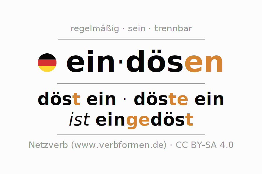 - Präsens: dös(e) (du) ein, dösen wir ein, döst (ihr) ein, dösen Sie ein