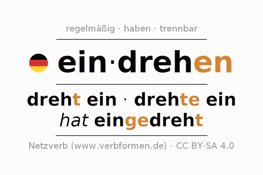 - Präsens: dreh(e) (du) ein, dreh(e)n wir ein, dreht (ihr) ein, dreh(e)n Sie ein
