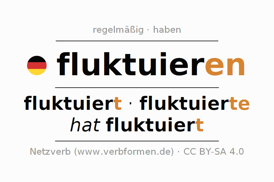 - Futur I: ich werde fluktuieren, du wirst fluktuieren, er wird fluktuieren, wir werden fluktuieren, ihr werdet fluktuieren, sie werden fluktuieren