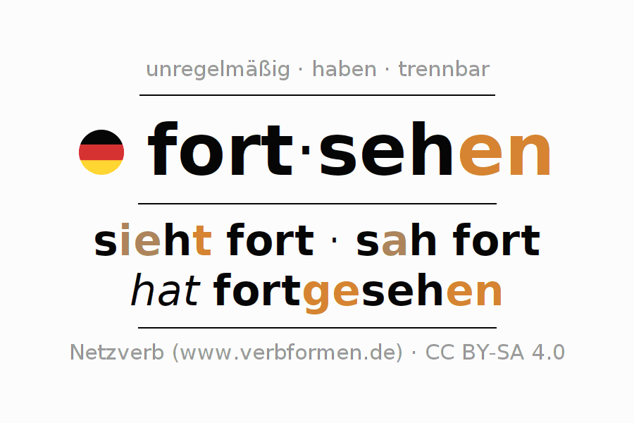 - Präsens: sieh (du) fort, seh(e)n wir fort, seht (ihr) fort, seh(e)n Sie fort