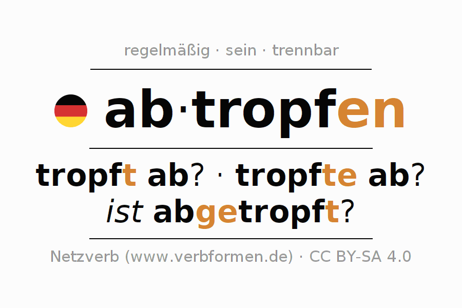 - Präsens: tropf(e) (du) ab, tropfen wir ab, tropft (ihr) ab, tropfen Sie ab