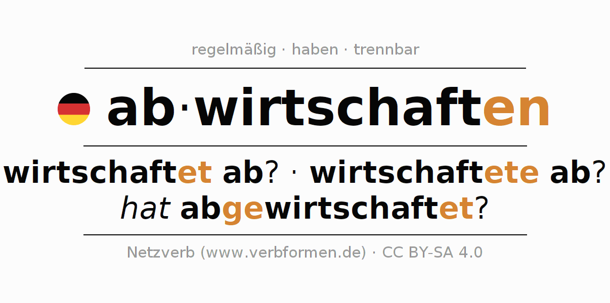 - Präsens: wirtschaft(e) (du) ab, wirtschaften wir ab, wirtschaftet (ihr) ab, wirtschaften Sie ab