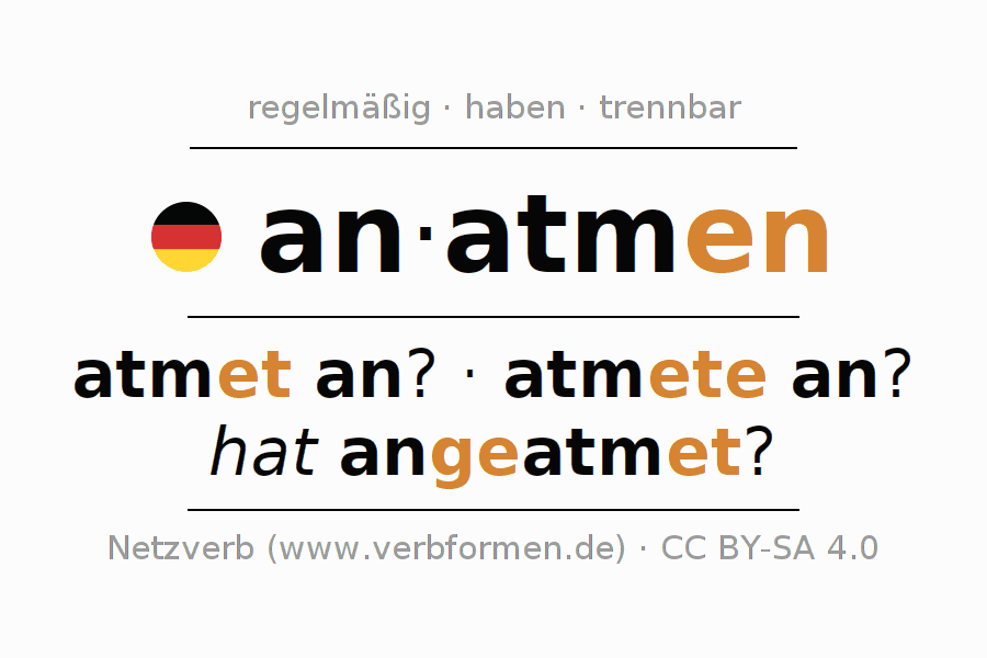 - Präsens: atme (du) an, atmen wir an, atmet (ihr) an, atmen Sie an