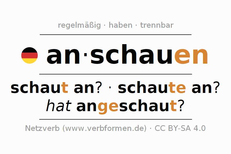 - Präsens: schau(e) (du) an, schau(e)n wir an, schaut (ihr) an, schau(e)n Sie an