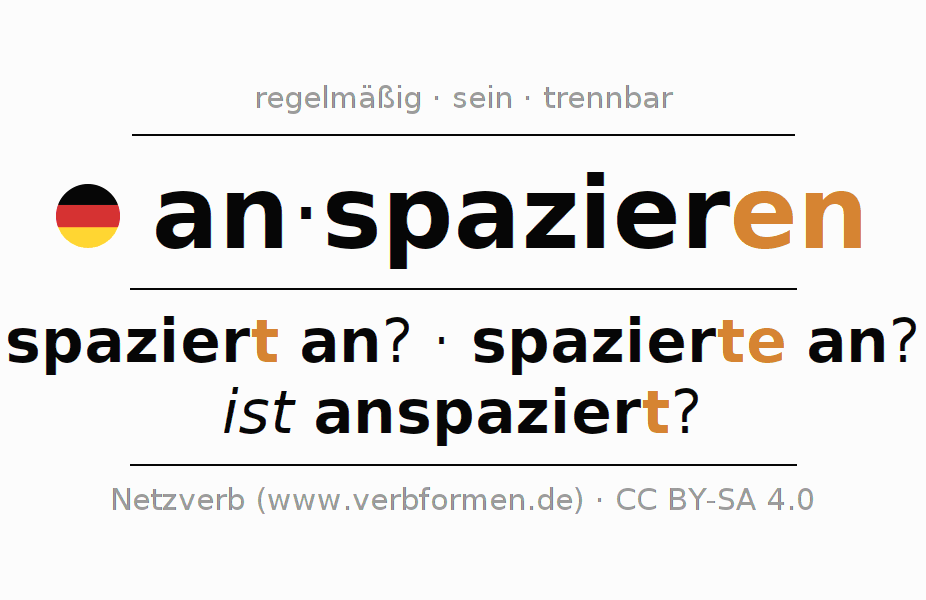 Die an·spazieren Konjugation online als Verbtabelle mit allen Verbformen in Singular (Einzahl) und Plural (Mehrzahl) in allen Personen (1. Person, 2.Person, 3. Person) übersichtlich dargestellt. Die Beugung bzw. Flexion des Verbs an·spazieren ist somit eine Hilfestellung für Hausaufgaben, Prüfungen, Klausuren, für den Deutschuntericht der Schule, zum Deutsch Lernen, für das Studium, Deutsch als Fremdsprache (DaZ), Deutsch als Zweitsprache (DaZ) und für die Erwachsenenbildung. Gerade auch für Deutschlernende ist die korrekte Konjugation des Verbs bzw. die korrekt flektierten Formen (spaziert an? - spazierte an? - ist anspaziert?) entscheidend. Weitere Informationen finden sich unter Wiktionary anspazieren und unter anspazieren im Duden.