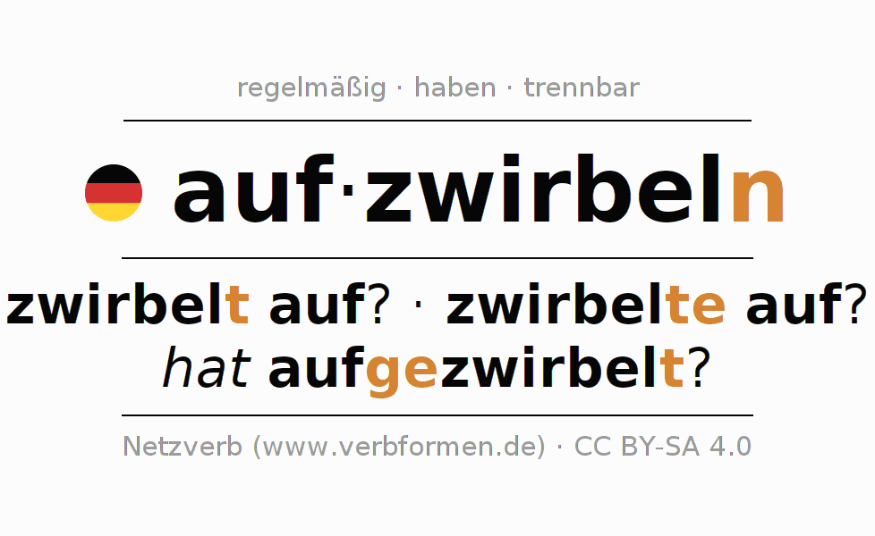- Futur I: werde ich aufzwirbeln?, wirst du aufzwirbeln?, wird er aufzwirbeln?, werden wir aufzwirbeln?, werdet ihr aufzwirbeln?, werden sie aufzwirbeln?