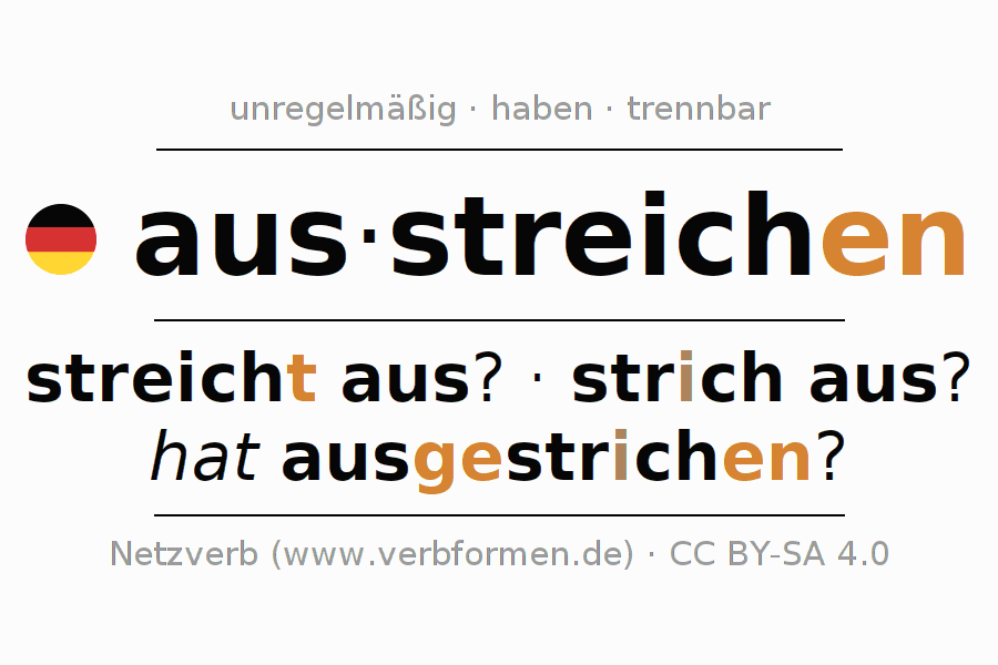 - Präsens: streich(e) (du) aus, streichen wir aus, streicht (ihr) aus, streichen Sie aus
