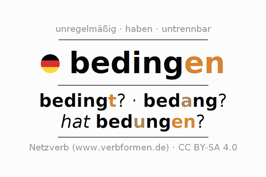 - Präsens: beding(e) ich?, bedingst du?, bedingt er?, bedingen wir?, bedingt ihr?, bedingen sie?