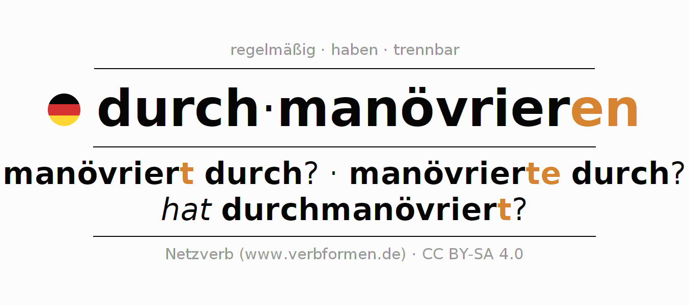 Das Verb durchmanövrieren konjugiert im Indikativ Aktiv in den Zeitformen Gegenwart, Vergangenheit und Zukunft