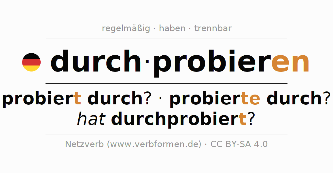 Die durch·probieren Konjugation online als Verbtabelle mit allen Verbformen in Singular (Einzahl) und Plural (Mehrzahl) in allen Personen (1. Person, 2.Person, 3. Person) übersichtlich dargestellt. Die Beugung bzw. Flexion des Verbs durch·probieren ist somit eine Hilfestellung für Hausaufgaben, Prüfungen, Klausuren, für den Deutschuntericht der Schule, zum Deutsch Lernen, für das Studium, Deutsch als Fremdsprache (DaZ), Deutsch als Zweitsprache (DaZ) und für die Erwachsenenbildung. Gerade auch für Deutschlernende ist die korrekte Konjugation des Verbs bzw. die korrekt flektierten Formen (probiert durch? - probierte durch? - hat durchprobiert?) entscheidend. Weitere Informationen finden sich unter Wiktionary durchprobieren und unter durchprobieren im Duden.