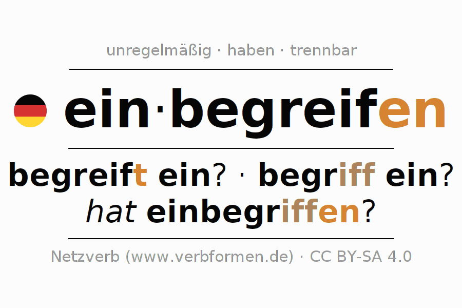 Die ein·begreifen Konjugation online als Verbtabelle mit allen Verbformen in Singular (Einzahl) und Plural (Mehrzahl) in allen Personen (1. Person, 2.Person, 3. Person) übersichtlich dargestellt. Die Beugung bzw. Flexion des Verbs ein·begreifen ist somit eine Hilfestellung für Hausaufgaben, Prüfungen, Klausuren, für den Deutschuntericht der Schule, zum Deutsch Lernen, für das Studium, Deutsch als Fremdsprache (DaZ), Deutsch als Zweitsprache (DaZ) und für die Erwachsenenbildung. Gerade auch für Deutschlernende ist die korrekte Konjugation des Verbs bzw. die korrekt flektierten Formen (begreift ein? - begriff ein? - hat einbegriffen?) entscheidend. Weitere Informationen finden sich unter Wiktionary einbegreifen und unter einbegreifen im Duden.