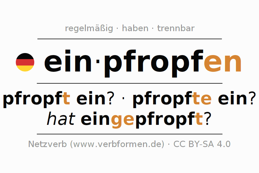 - Präsens: pfropf(e) ich ein?, pfropfst du ein?, pfropft er ein?, pfropfen wir ein?, pfropft ihr ein?, pfropfen sie ein?