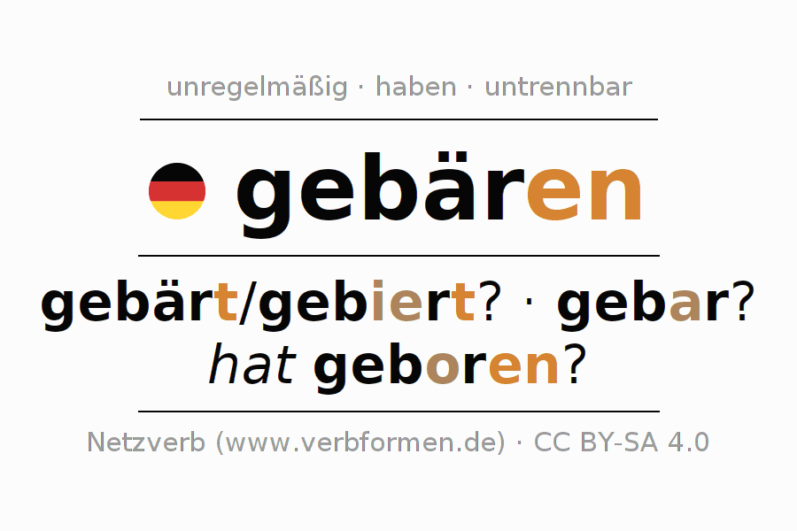 Die gebären Konjugation online als Verbtabelle mit allen Verbformen in Singular (Einzahl) und Plural (Mehrzahl) in allen Personen (1. Person, 2.Person, 3. Person) übersichtlich dargestellt. Die Beugung bzw. Flexion des Verbs gebären ist somit eine Hilfestellung für Hausaufgaben, Prüfungen, Klausuren, für den Deutschuntericht der Schule, zum Deutsch Lernen, für das Studium, Deutsch als Fremdsprache (DaZ), Deutsch als Zweitsprache (DaZ) und für die Erwachsenenbildung. Gerade auch für Deutschlernende ist die korrekte Konjugation des Verbs bzw. die korrekt flektierten Formen (gebärt/gebiert? - gebar? - hat geboren?) entscheidend. Weitere Informationen finden sich unter Wiktionary gebären und unter gebären im Duden.