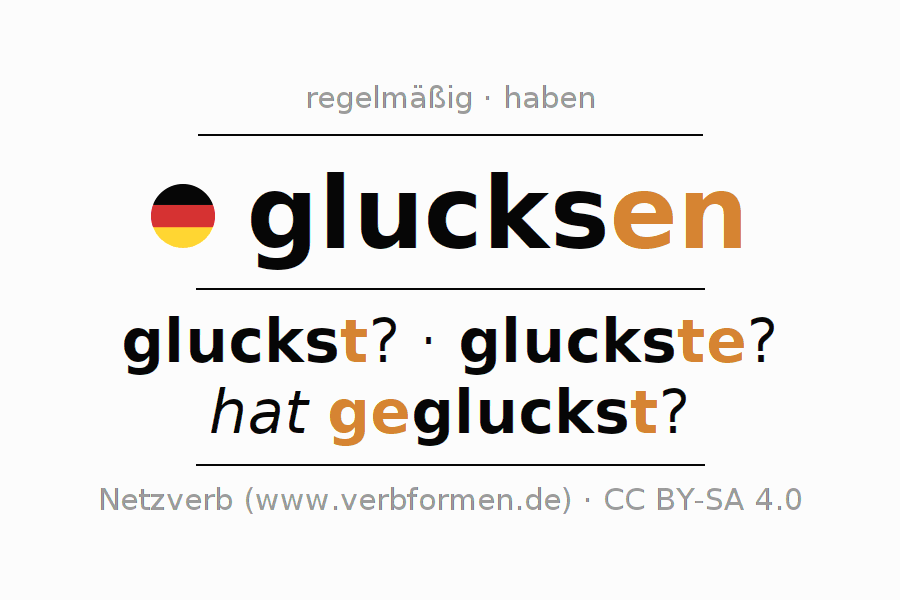 Das Verb glucksen konjugiert im Indikativ Aktiv in den Zeitformen Gegenwart, Vergangenheit und Zukunft