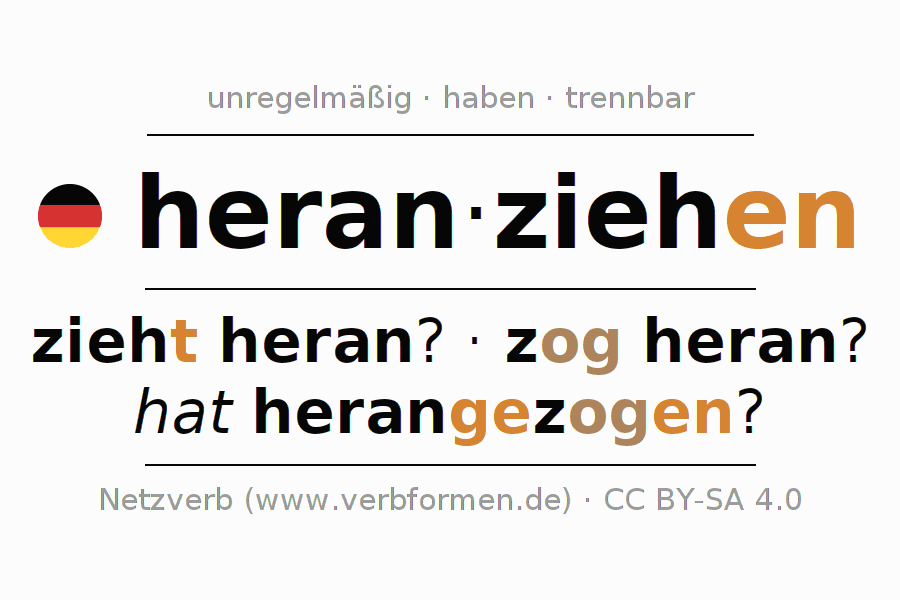 Das Verb heranziehen (hat) konjugiert im Indikativ Aktiv in den Zeitformen Gegenwart, Vergangenheit und Zukunft
