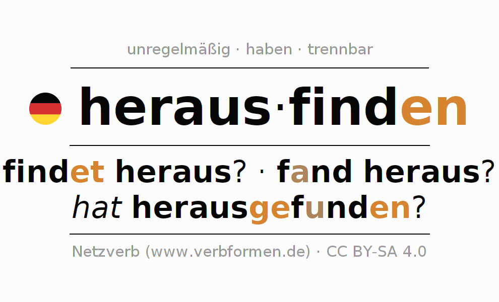 - Präsens: find(e) (du) heraus, finden wir heraus, findet (ihr) heraus, finden Sie heraus