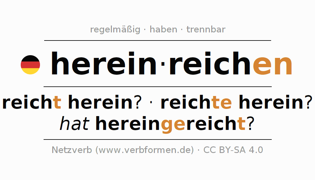 - Präsens: reich(e) (du) herein, reichen wir herein, reicht (ihr) herein, reichen Sie herein
