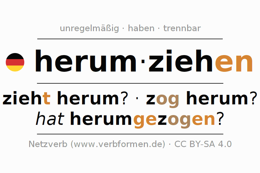 - Perfekt: habe ich herumgezogen?, hast du herumgezogen?, hat er herumgezogen?, haben wir herumgezogen?, habt ihr herumgezogen?, haben sie herumgezogen?